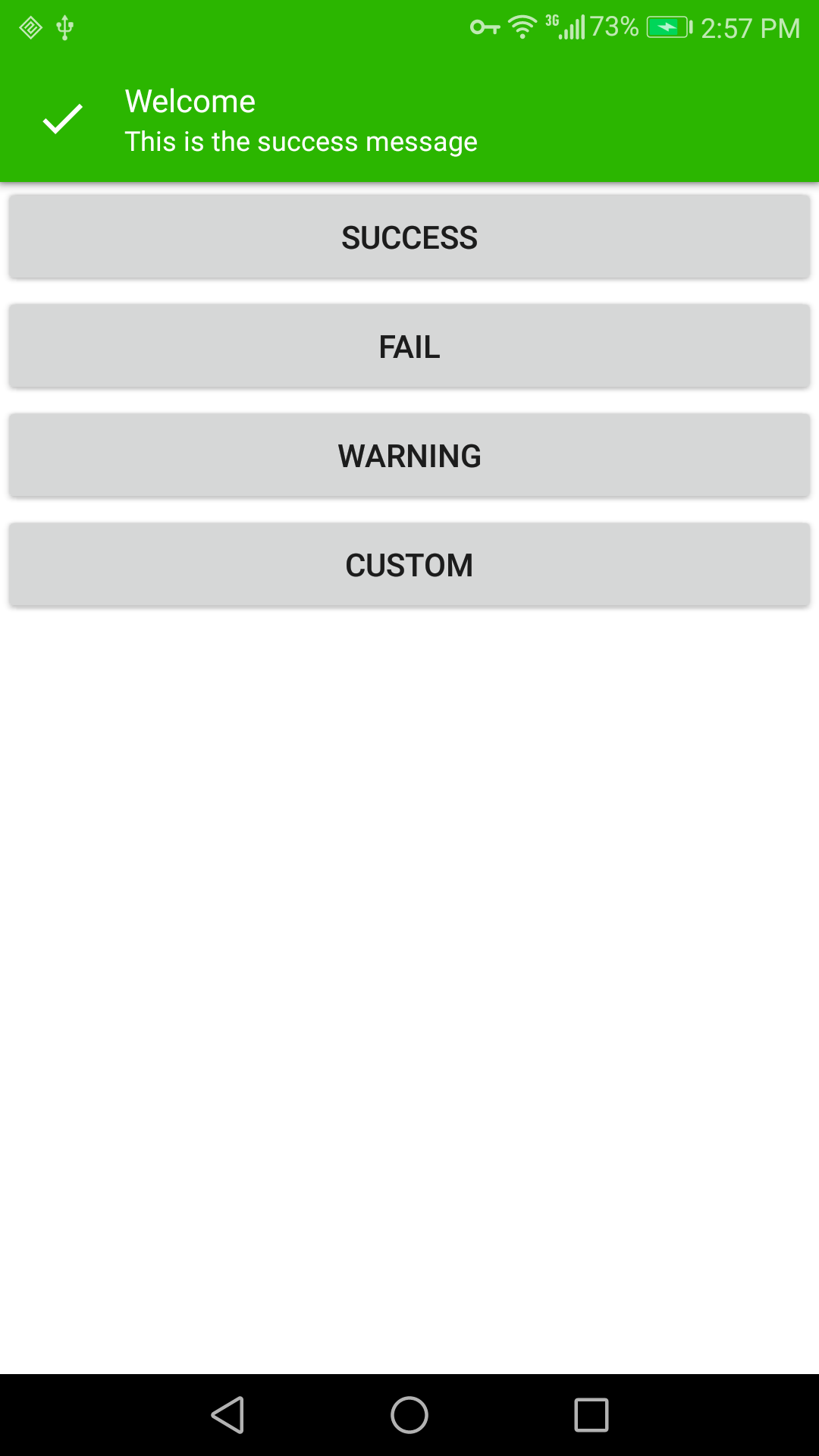 برای مثال، یک کتابخانه برای اندروید به نام Sneaker در گیتهاب وجود دارد که یک Alert باکس را به صورت کشویی از بالا به پایین به کاربر نشان می دهد. با این استدلال باید بتوانیم همچین چیزی داشته باشیم: (صد البته بعد از دانلود و فراخوانی لایبرری)