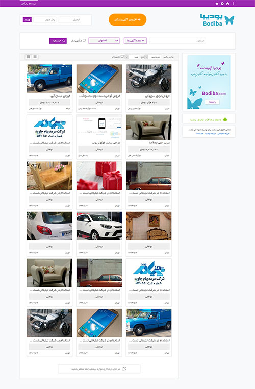 وب سایت بودیبا به عنوان یک مرجع آگهی های تبلیغاتی برای خرید و فروش کالاهای نو دست دوم مشابه سایت هایی مثل دیوار و شیپور می باشد. این وب سایت امکانات کاملی نظیر آگهی فوری، ویژه، جستجوی پیشرفته، دسته بندی کامل محصولات و ... دارد.